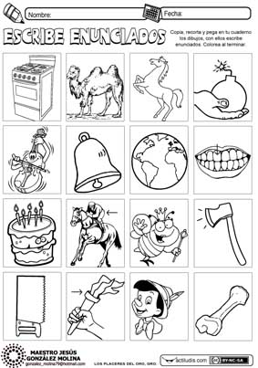 Partiendo de los dibujos de la ficha, se recortan y pegan en la libreta de trabajo para crear enunciados relacionados con los mismos. Actividad para desarrollar en 2º de Primaria.