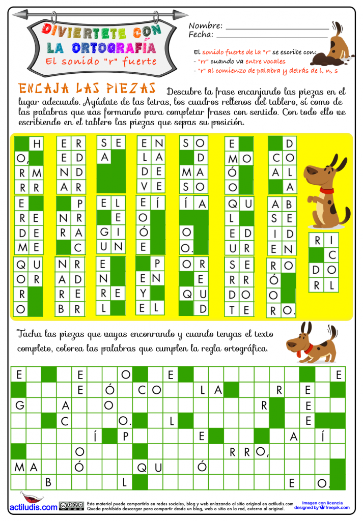 En la siguiente actividad se trabaja la regla ortográfica que nos indica que se escribe con «r» cuando el sonido es fuerte en los casos de: