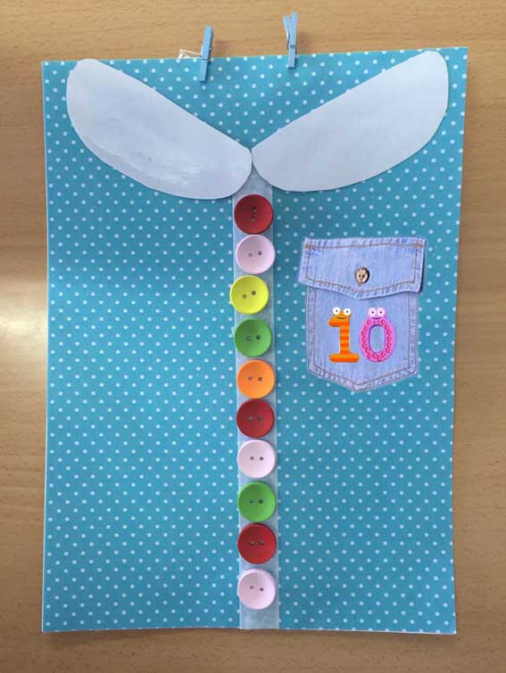 Otra idea que me ha realizado mi compañera mi compañera Rosa Mª Zurera Cosano del CEIP Alonso de Aguilar para que los más pequeños puedan contar y aprender hasta el diez. Se trata de una «camisa» a la que le podemos añadir y quitar botones.
