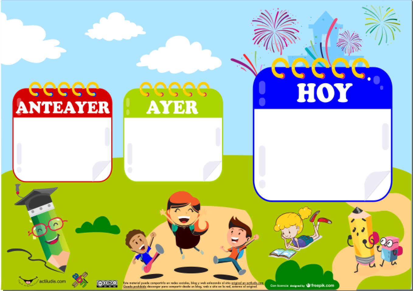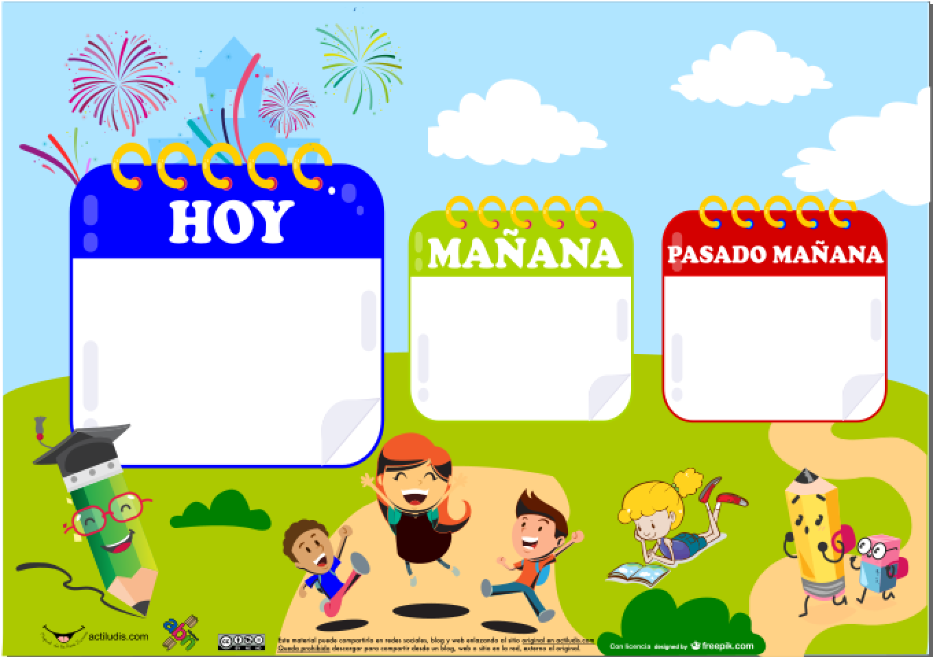 Tres fichas que pueden ser impresas o usadas desde la pizarra digital para trabajar, a partir del día en el que estemos, los conceptos de anteayer, ayer, mañana y pasado mañana. Para ello ponemos el día del mes en el que nos encontremos y a continuación completamos los otros dos días que lo acompañan.