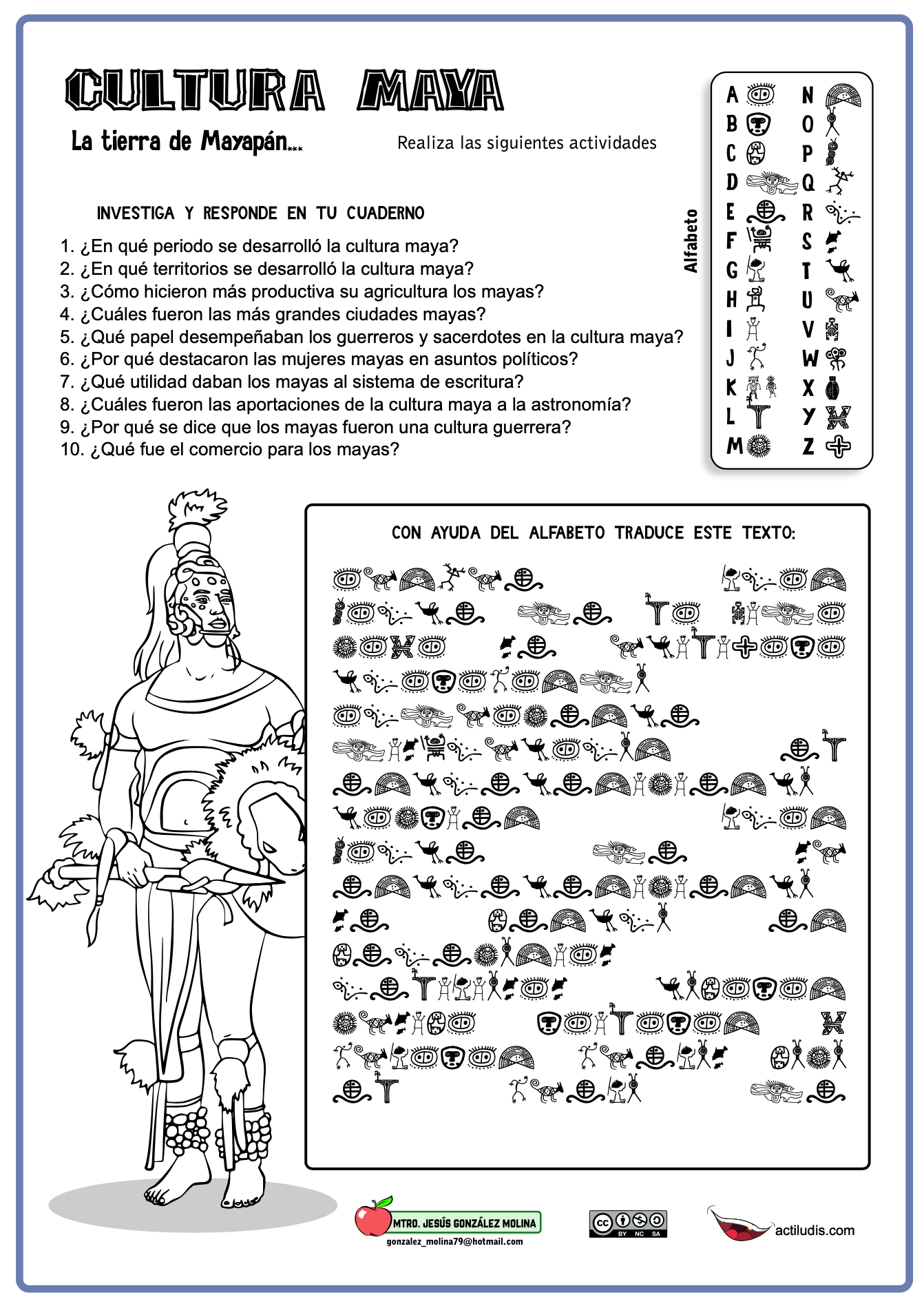 Material para trabajar la cultura maya en la que se propone al alumnado una serie de actividades para investigar y responder preguntas que abarcan un amplio espectro de los maya. Además en esta actividad encontrarán un juego muy motivador, consistente en descifrar un texto a partir de las claves que nos proporcionan símbolos de la cultura maya.