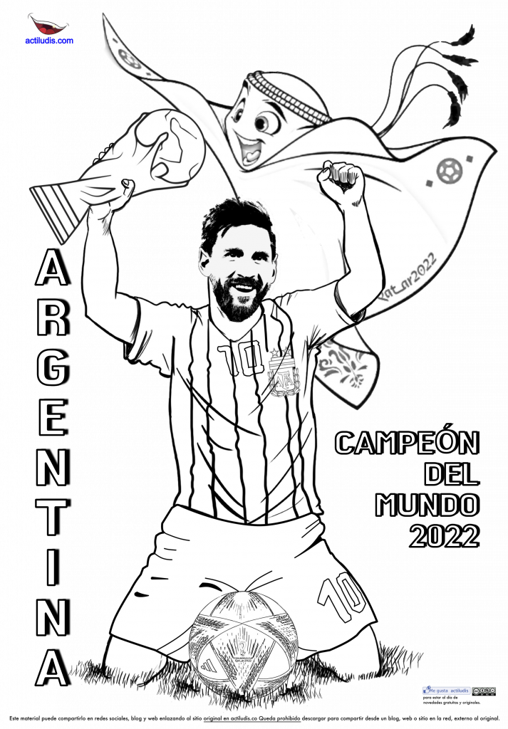 Con esta ficha para colorear, homonajeamos desde actiludis.com a Argentina, campeona del mundial de futbol 2022. Un mundial polémico por el transfondo de la elección de la sede, pero con la esperanza que el deporte sea lo que realmente deber ser.