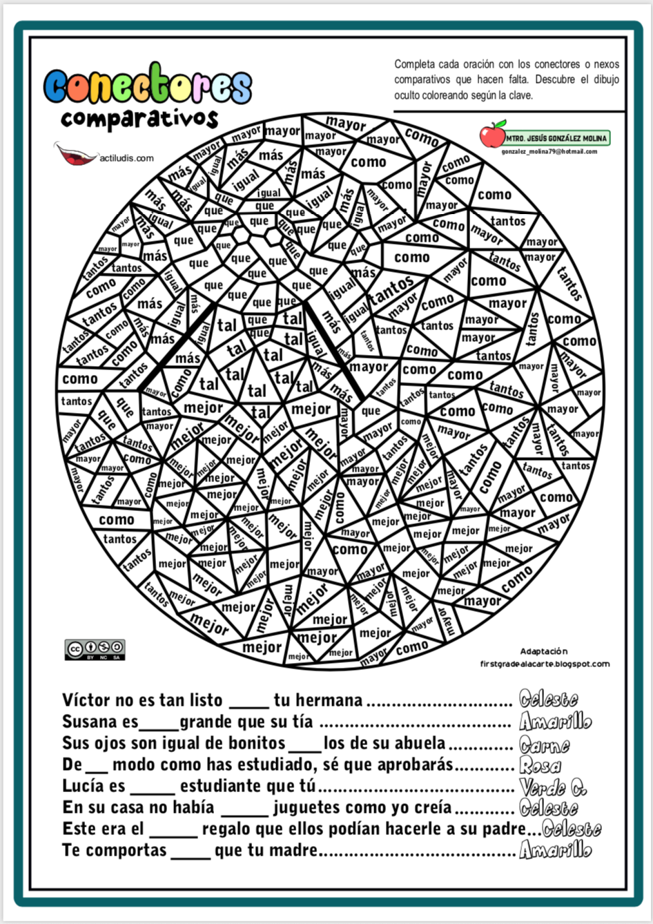 En la siguiente actividad deberán buscar los conectores o adverbios comparativos para completar las frases y colorear el dibujo oculto con los colores que se dan en la clave.