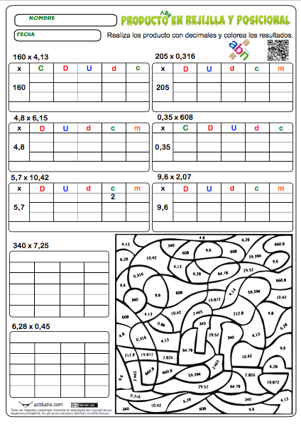 La siguiente ficha está pensada para reforzar el dominio de productos con decimales hasta las milésimas. En ella el alumnado encontrará productos de enteros por décimas y centésimas, de décimas por décimas y de décimas por centésimas. Además en esta actividad aparecen los dos formatos, rejilla ABN y posicional que el alumnado del tercer ciclo de Primaria debe dominar.