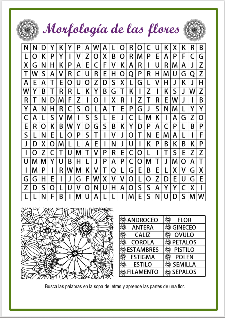 A través de usa sopa de letras como elemento motivador, el alumnado trabajará la morfología de las flores.