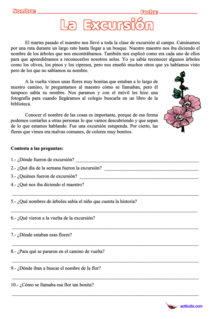 Prueba de velocidad lectora y comprensión lectora para 2º: «La excursión»