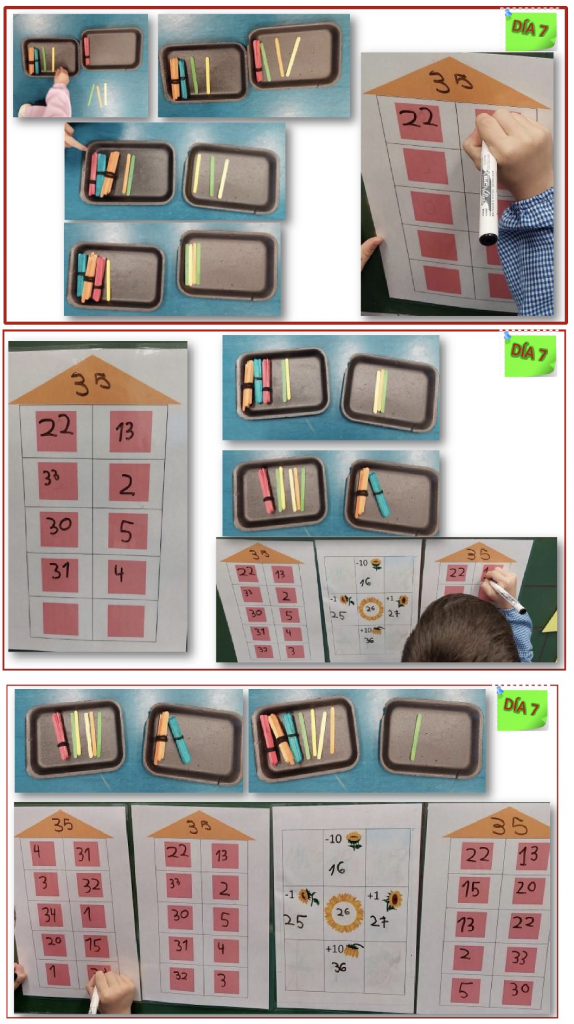Día 7: el calendario pide la descomposición del número 35 de todas las formas posibles, al encontrarnos en el 1 trimestre de 5 años, sólo hacemos algunas descomposiciones utilizando dos bandejas con palitos, el modelo de la casita y la técnica de darle la vuelta como aplicación de la propiedad conmutativa.