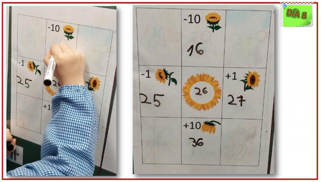 Día 8: identificación y escritura se los vecinos del número 26 y sin apoyo de la tabla del 100 ya que tienen asumido los patrones del más menos uno y más menos una decena.