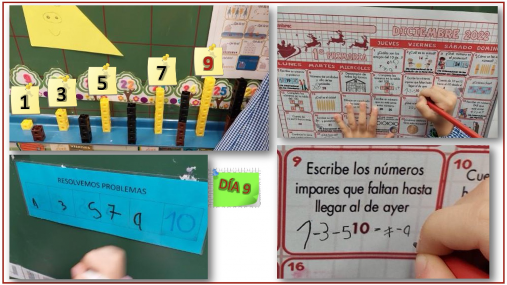 Día 9: los números impares que hay en la secuencia numérica hasta el número 10. aunque los números pares e impares ya han sido tratados con diferentes estrategias: