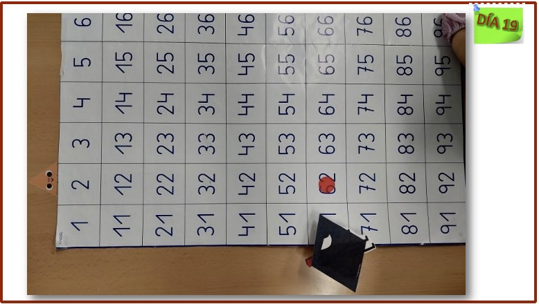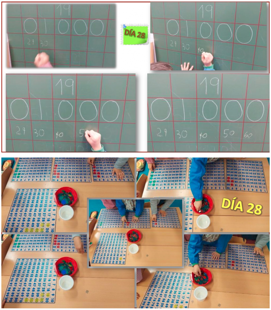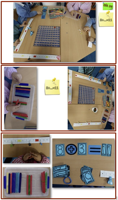Día 24: “Se trata de averiguar el número que falta en una operación 8 + … = 11”. Es una situación de resta en escalera ascendente o añadir hasta un tope. Lo hemos realizado con diferentes recursos y niveles de abstracción en función del nivel de cada niño/a: recta numérica, tabla del 100, palillos y grafías.