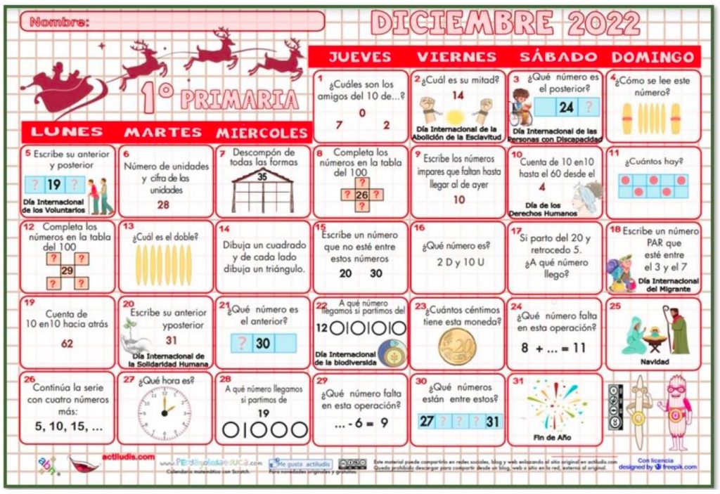 Rutinas diárias en Infantil con nuestro calendario matemático de 1º de Primaria del mes de diciembre IV