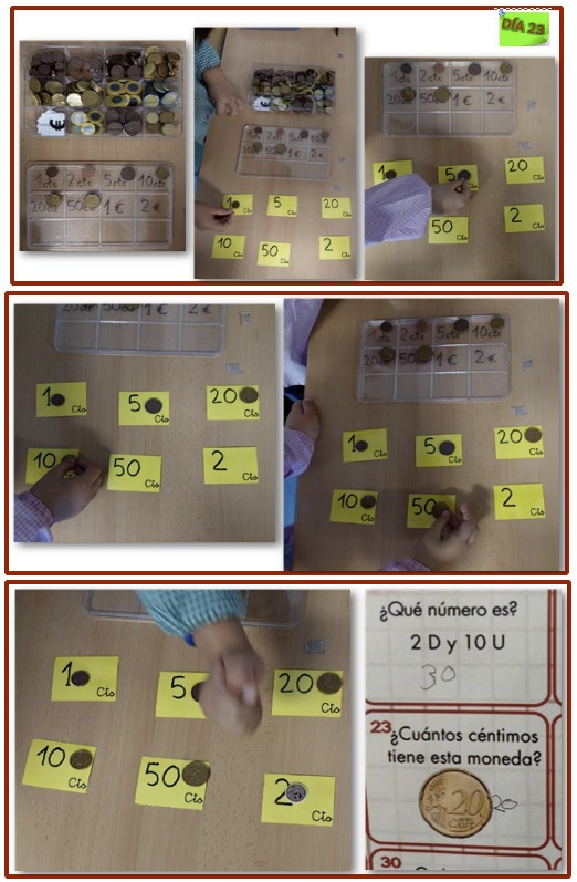 Día 23: “Se pregunta por la cantidad de céntimos que hay en una moneda de 20 céntimos”. Lo hemos hecho con todas las monedas de céntimos de euro.