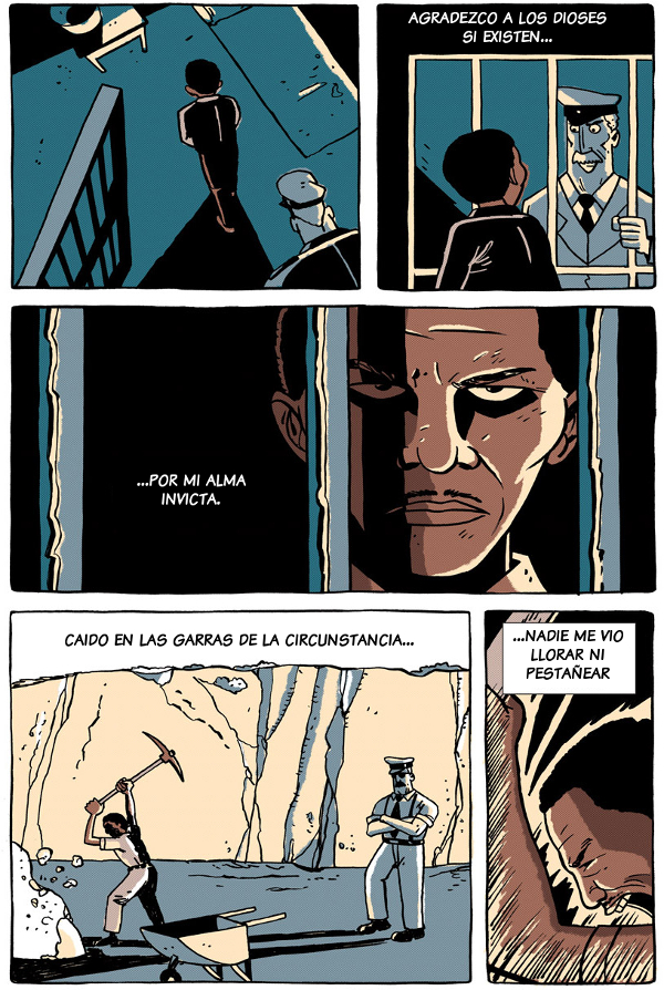 Sobre el cómic: Mandela tuvo que romper piedras día tras día en una cantera de piedra caliza. A través de los días, meses y años de trabajo agotador, el resplandor de la roca blanca dañaría permanentemente la vista de Mandela. La fotografía que está mirando es de sí mismo con su hijo mayor, Madiba Thembekile, quien murió en un accidente de coche en 1969. A Mandela no se le permitió asistir al funeral e incluso obtener información sobre el accidente. A través de los años, debido a la forma de ser de Mandela, se ganó el respeto y la amistad de algunos de sus guardias. Un carcelero, James Gregory, incluso escribió un libro sobre su relación con Mandela que se convirtió en una película.