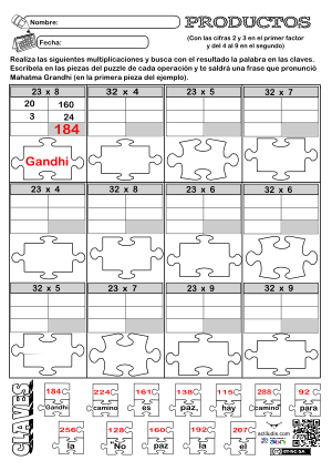 La siguiente ficha estaría dentro del artículo que dedico al «producto con multiplicador de 1 cifra«, pero la publico, también, individualmente debido a que trabaja la conocida frase de M. Gandhi «No hay camino para la Paz, la Paz es el camino». Ésta ficha está pensada para trabajar las tablas del 2 y 3 pero con el multiplicador mayor a 4, con lo cual trabajamos el producto conmutativo de ambas tablas.