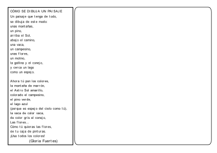 Esta poesía de Gloria Fuertes la trabajamos de modo diferente según sea la edad del alumnado. Así en 6º curso hacemos un dictado cuyo contenido es el poema y a continuación la plasman gráficamente con diferentes técnicas plásticas. En los restantes cursos les doy una ficha con el poema escrito, y un recuadro donde deben dibujar el paisaje sugerido por Gloria Fuertes.