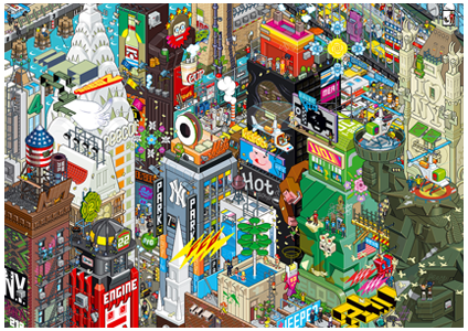 Este es una propuesta bastante sencilla a partir de una imagen extraida de Devianart y cuyo es autor Docdoom, hay que buscar a la mujer que aparece a continuación. La imagen, en formato pdf, se pueden imprimir para poner en la clase y también la dejo digitalizada para poder ver desde el ordenador.