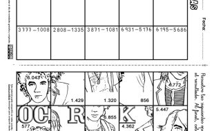 Veinte operaciones de restar con unidades de millar. Puede realizarse dentro de cada celda, mentalmente o usar rejillas ABN para su resolución. Dejamos una plantilla de rejillas para imprimir si el docente lo considera necesario. El puzle está montado a partir de un dibujo de la película musical juvenil «Camp … Sigue leyendo Restas hasta las unidades de millar