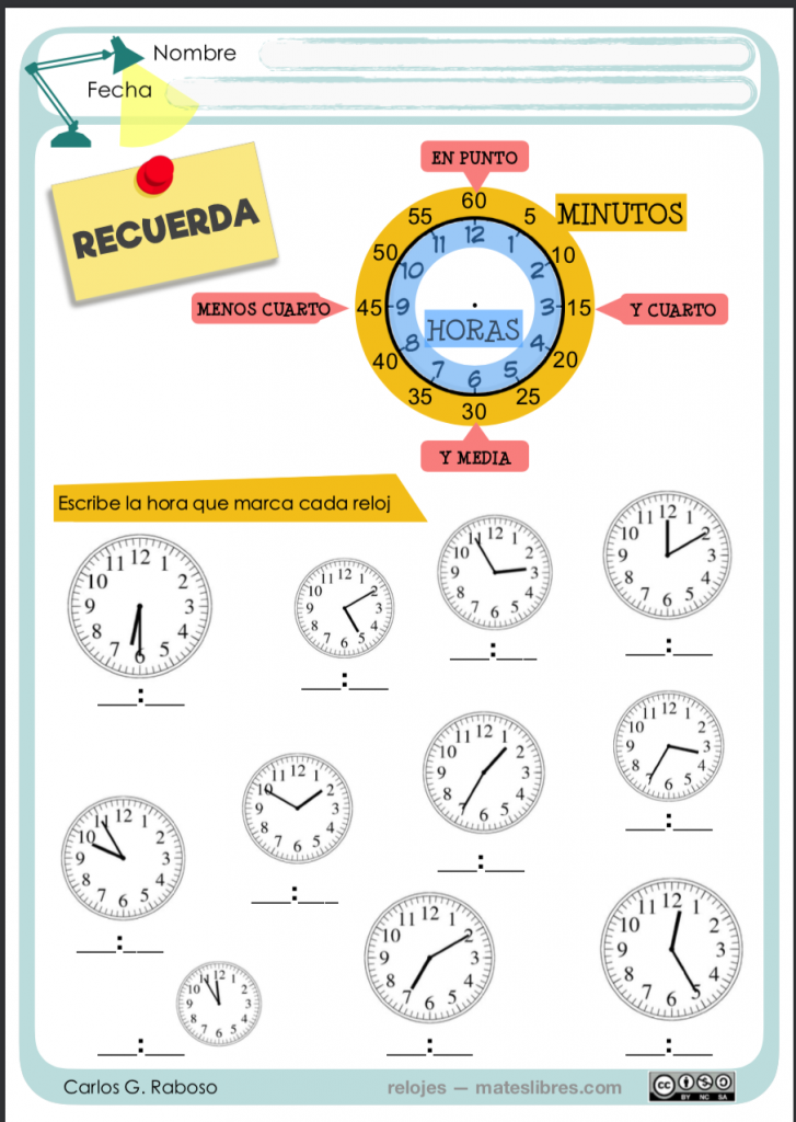Con esta actividad repasamos las horas. Para ello se presenta una ficha donde aparecen distintos relojes analógicos en el que hay que identificar qué hora es.