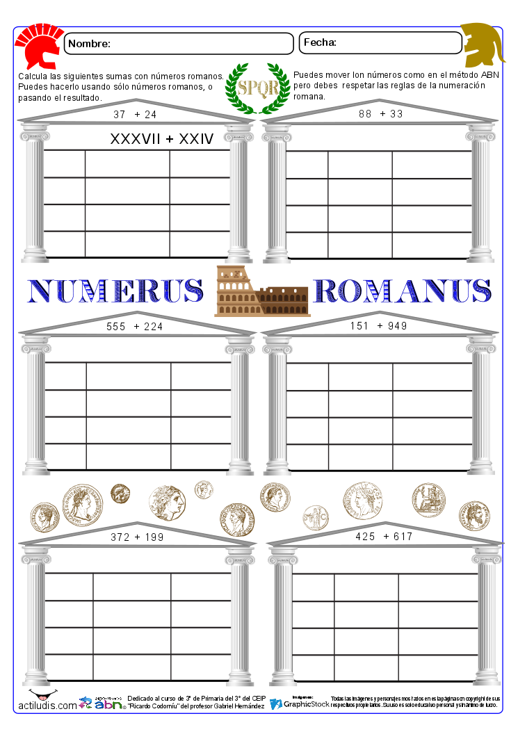 A partir de un artículo en el muro del Facebook ABN escrito por Gabriel Hernández maestro de un grupo de 3° del CEIP «Ricardo Codorníu» en el que contaba que un alumno le preguntó si se podían hacer «sumas ABN» con números romanos y mostró el resultado; le comenté entonces que iba a crear una ficha dedicada a su curso para poder practicar en ella y aquí está realizada la promesa.