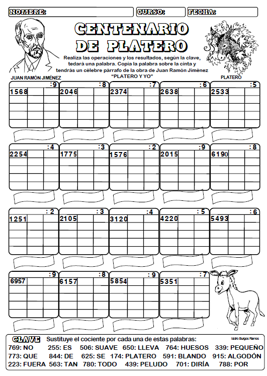 Dos fichas para trabajar las divisiones con el fondo del centenario de la obra «Platero y Yo» de Juan Ramón Jiménez, en las cuales hay que descubrir un pequeño párrafo de la misma.