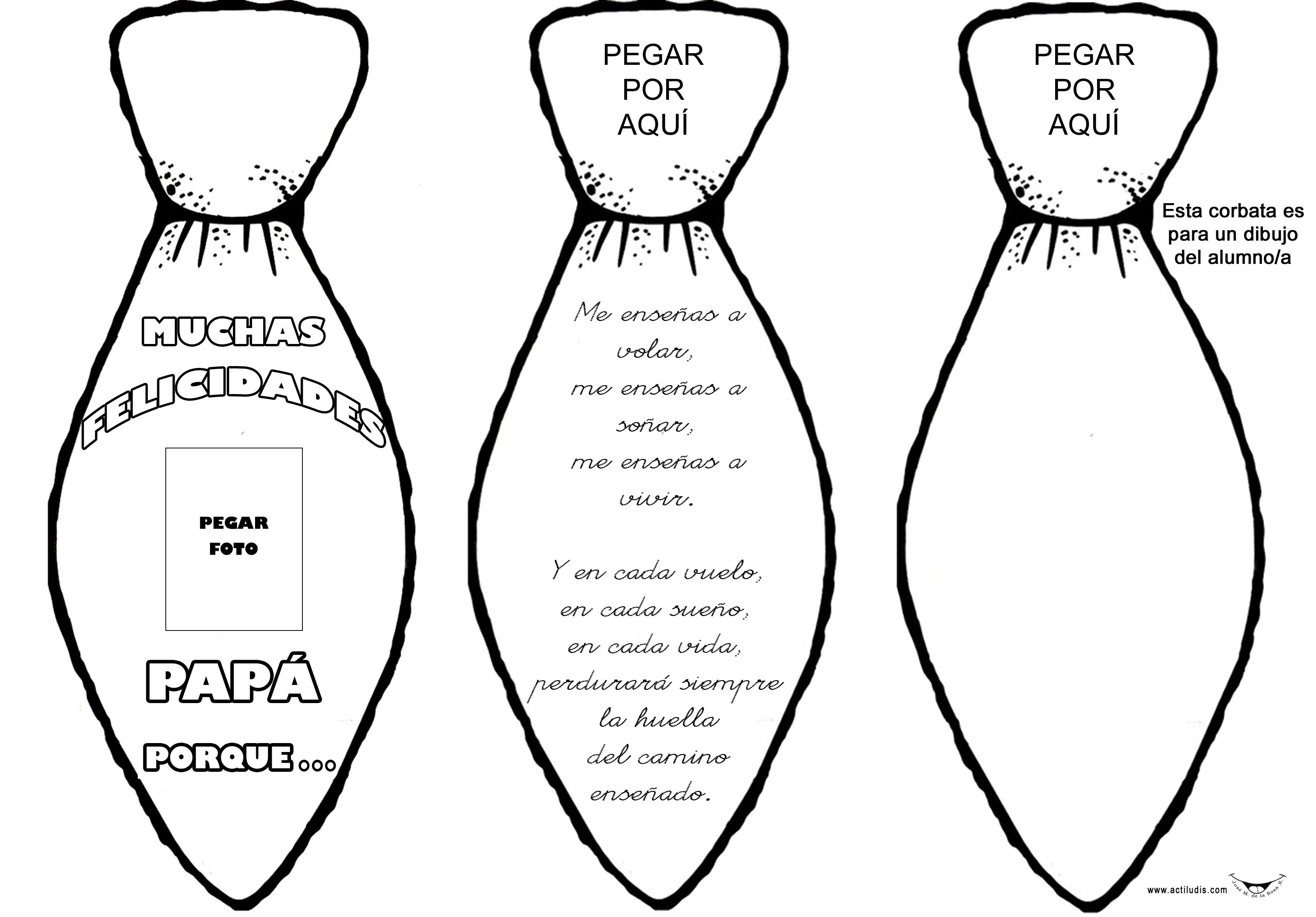 Las tres corbatas se pegan, por la parte del nudo, siguiendo el orden en que están en la ficha. En la primera corbata, junto a la felicitación, hay un espacio para poner la foto del niño/a. En la segunda una poesía modificada ligeramente de la madre Teresa de Calcuta, escrita con letra escolar punteada (la poesía original la tenéis al final del artículo) y en la última un espacio para dibujar.