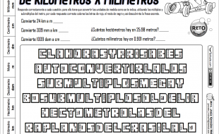 Jesús González Molina Esc. Primaria “Vicente Guerrero” de Los Placeres del Oro, Guerrero, México, nos envía una ficha para trabajar el paso de kilómetros a milímetros y viceversa, para lo cual preparado una actividad con un texto oculto que debe descifrar pasando las unidades propuestas. Además ha incluido en la ficha una … Sigue leyendo De kilómetos a milímetros