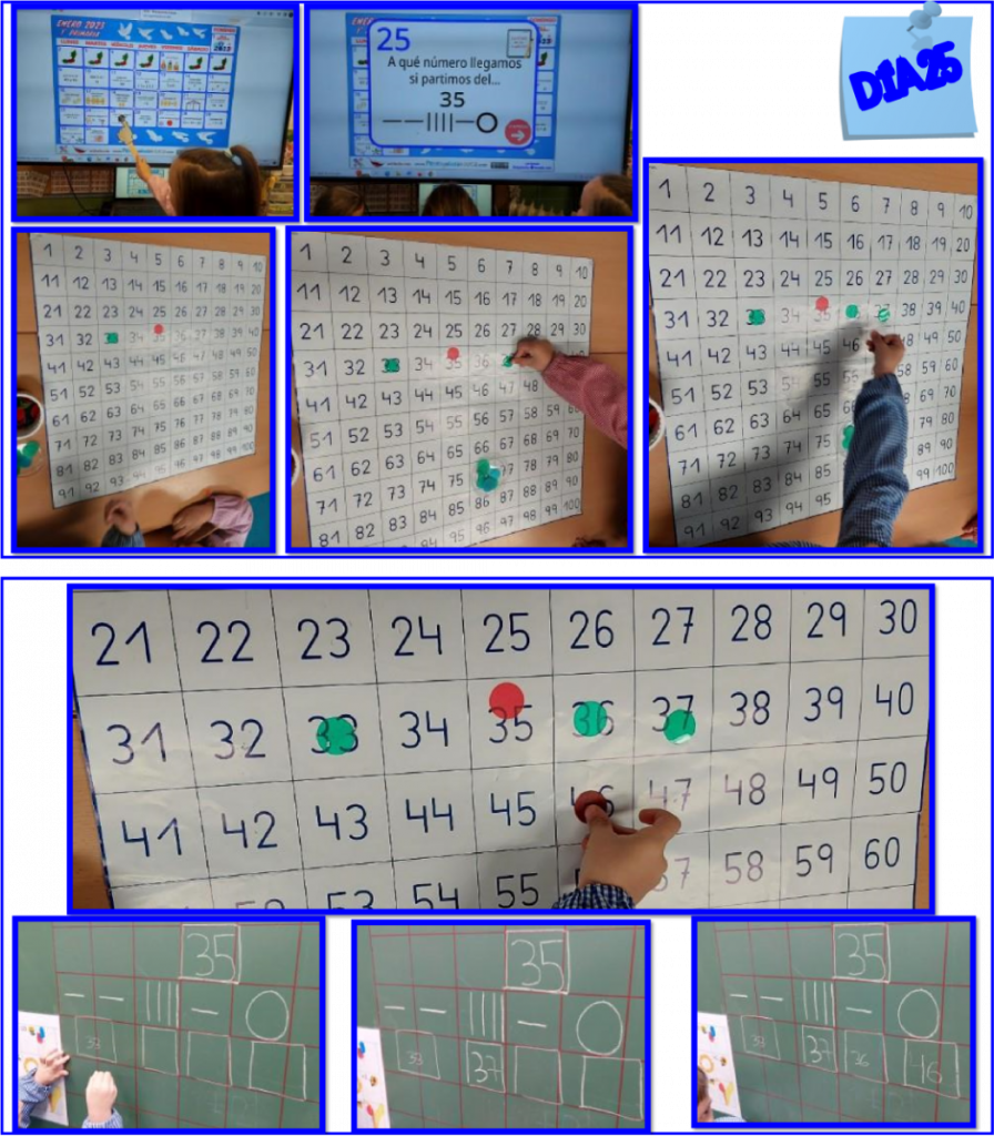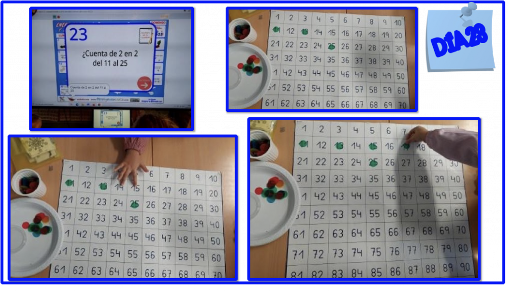 Día 23: contar de 2 en 2 desde un número impar y mayor a la primera decena supone en el nivel de infantil de 5 años todo un reto, por ello nos apoyamos en la tabla del 100, con fichas traslúcidas que les permite secuenciar y visualizar dicho patrón.