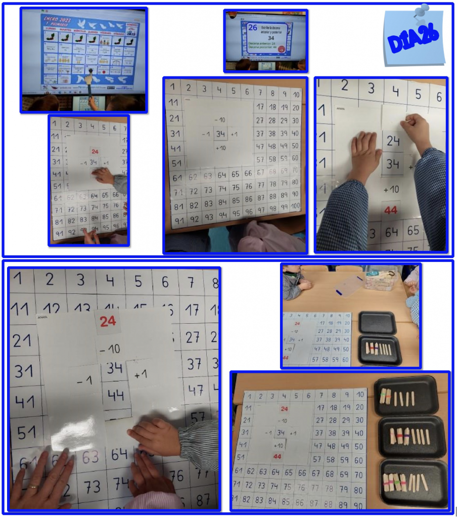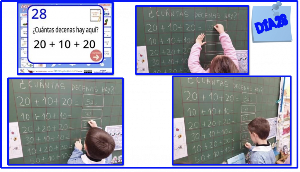 Día 28: al preguntar cuántas decenas hay en una representación con signos numéricos, es necesario que tengan un poco claro cuándo se pregunta por decenas o por unidades, por ello, se llevan a cabo algunas ejemplificaciones similares a la propuesta en el calendario.