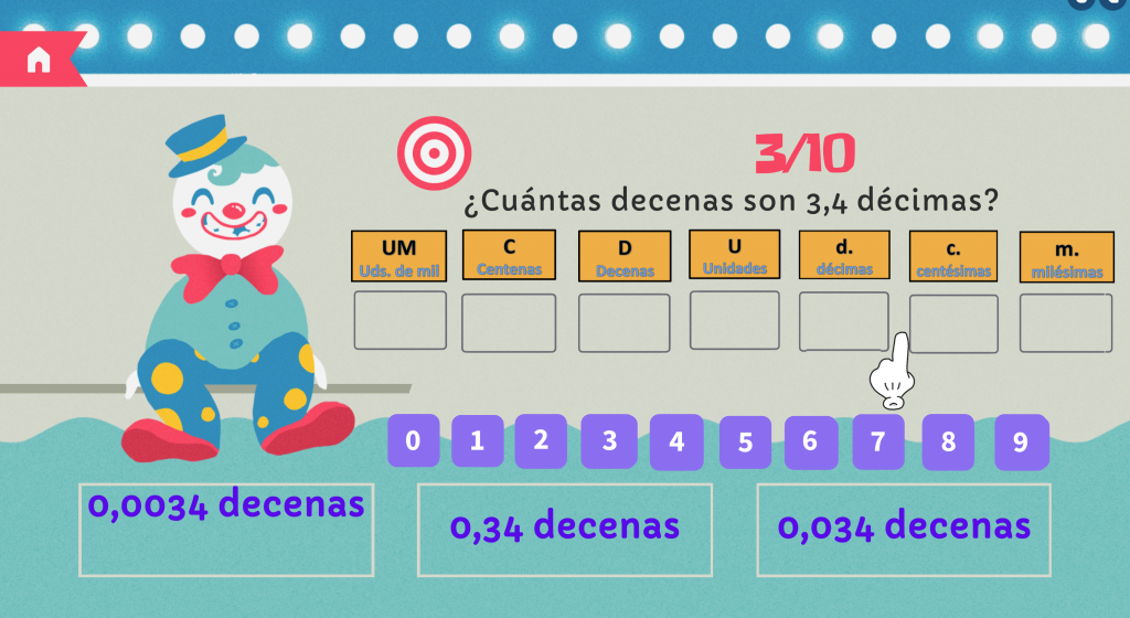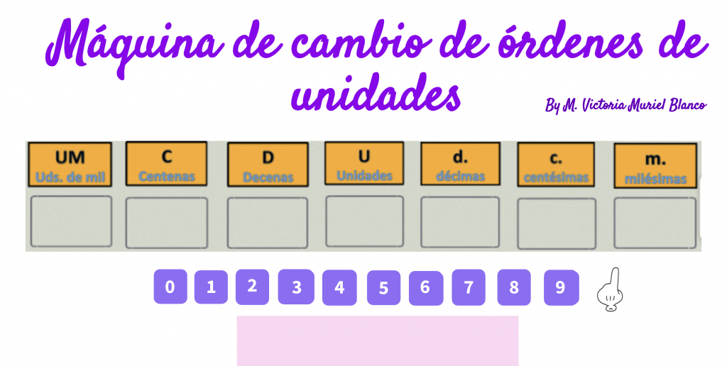En el primer genially «La máquina de los cambios» nos permite trabajar, en la pizarra digital, tantas veces como necesitemos, ya sea utilizando los elementos arrastrables o escribiendo sobre la pantalla. Aparece una mano que podemos arrastrar y que representa la coma decimal.