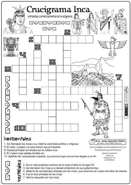 Este crucigrama realizado el profesor Jesús González Molina de la Escuela Primaria Vicente Guerrero, desde Los Placeres del Oro, Guerrero, México lo creado para trabajar términos relacionados con la historia de América precolombina en la cultura inca.