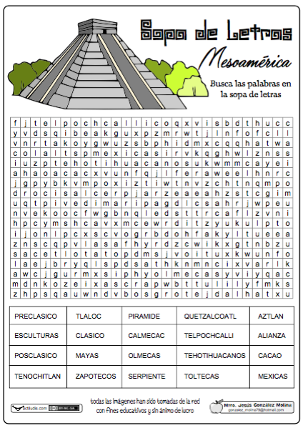 Esta sopa de letras sobre Mesoamérica la ha realizado el profesor Jesús González Molina de la Escuela Primaria Vicente Guerrero, desde Los Placeres del Oro, Guerrero, México para trabajar mediante un juego de sopa de letras, varios términos relativos con Mesoamérica que es la región del continente americano que comprende la mitad meridional de México, los territorios de Guatemala, El Salvador y Belice, así como el occidente de Honduras, Nicaragua y Costa Rica.