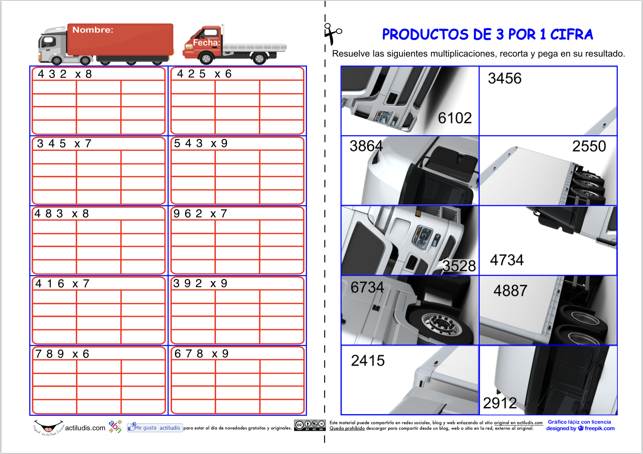 La siguiente actividad está pensada para repasar el producto de las tablas de multiplicar más complicadas (6,7,8 y 9), para lo cual he graduado el nivel de dificultad desde productos de estas cifras por números formados con cifras menores de 5, hasta llegar a productos con números mayores de 5.
