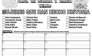 Con motivo del día de la mujer trabajadora, el próximo 8 de marzo, Isidro Burgos Ramos (Adra), ha preparado una ficha con los juegos del bingo y sopa de letra con la temática de mujeres que han hecho historia. Saber de estas mujeres, de reconocimiento internacional, puede ser el comienzo … Sigue leyendo Mujeres que han hecho historia.