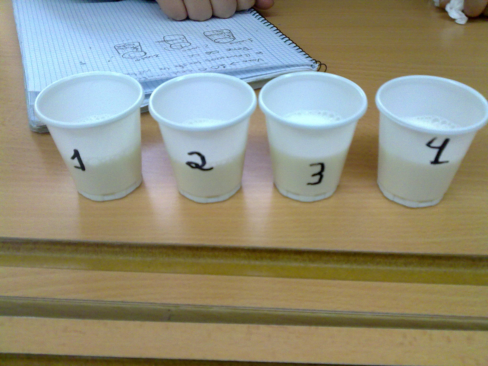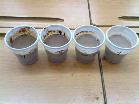 2.- Pedimos que numeren los vasos del 1 al 5. Este número nos indicará el número de cucharadas de cacao que hemos puesto dentro.