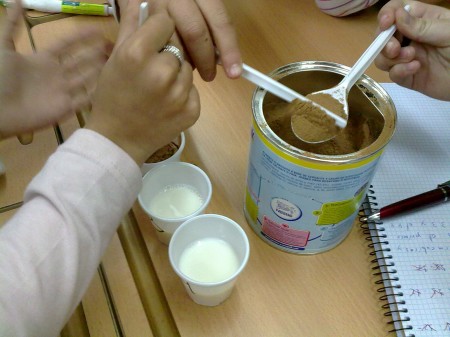 Vamos a echar en vasos leche con distintas cantidades de cacao, para posteriormente determinar cúal nos parece la más apetecible según el aspecto y el sabor, para posteriormente averiguar matemáticamente qué cantidad de cacao deberíamos echar en cantidades de leche mayores, sin necesidad de realizarlo en la práctica.