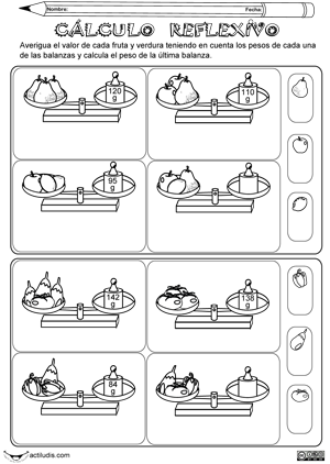 Con la siguiente ficha se debe averiguar el valor de cada imagen según las combinaciones que presentan las siguientes situaciones. Con esta actividad se trabaja el cálculo y la reflexión para lograr que todas las operaciones cuadren. Esta ficha en concreto se puede realizar a partir de tercero de primaria, ya que la dificultad mayor son divisiones de tres cifras entre una.