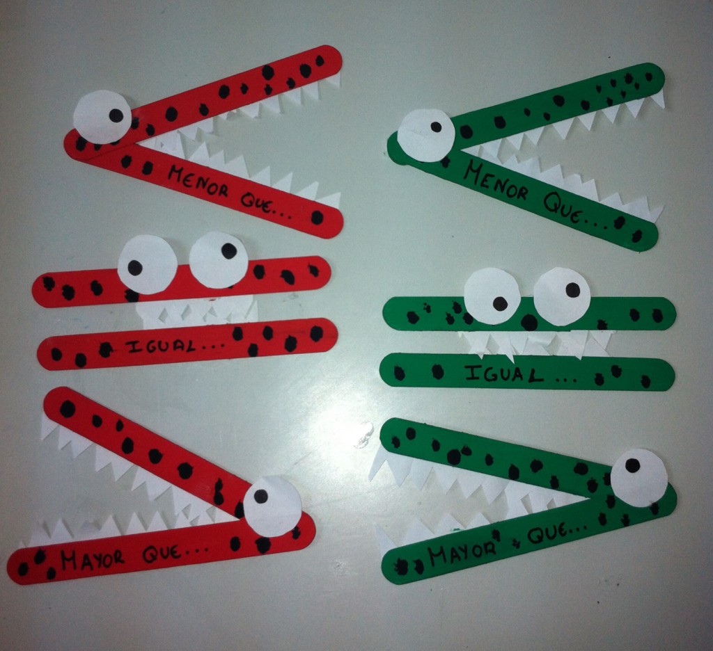 Continuamos con buenas ideas para trabajar en clase, en esta ocasión Juan Antonio Durán Siles del C.R.A. “Riscos de Villavieja” en Barrado (Cáceres) nos envía unos simpáticos signos que ha hecho con depresores( de los médicos) para trabajar los conceptos de mayor que…,menor que… e igual… Previamente sus alumnos representan los números con los palillos(que imprimió y plastificó) para que lo vean más claro….y luego colocan el signo que correspondan.