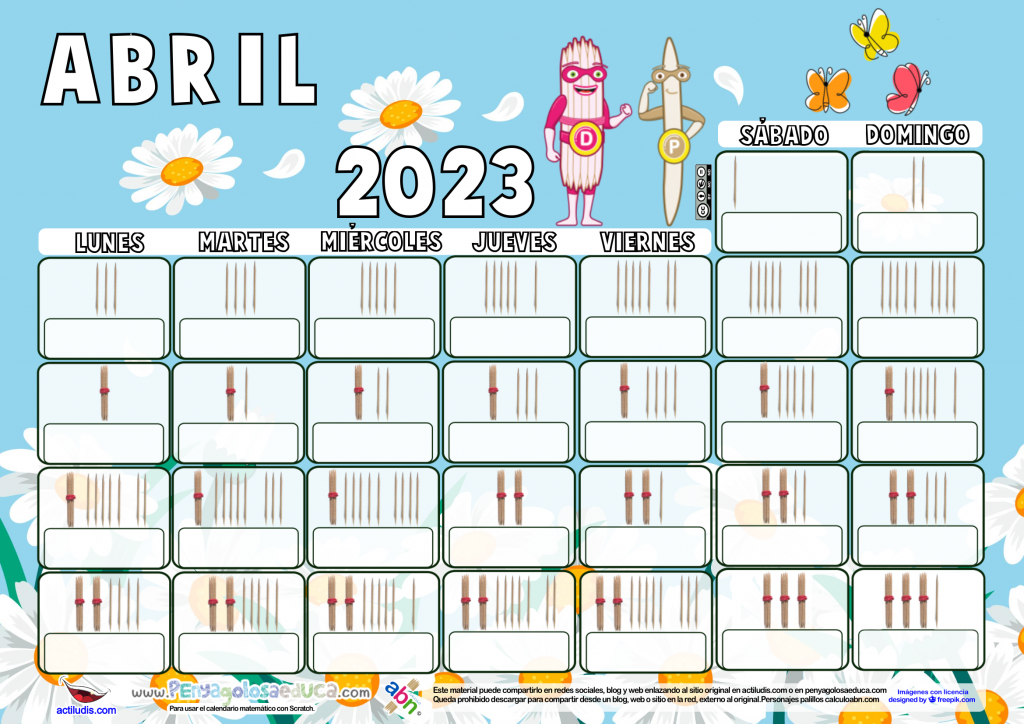 Calendario con representación de los días del mes de ABRIL con palillos. Este material está pensado para Educación Infantil y Primero de Primaria con el que trabajar el calendario. La idea es que el alumnado use el calendario como rutina identificando el día e identificando el número que corresponde con los palillos representados.
