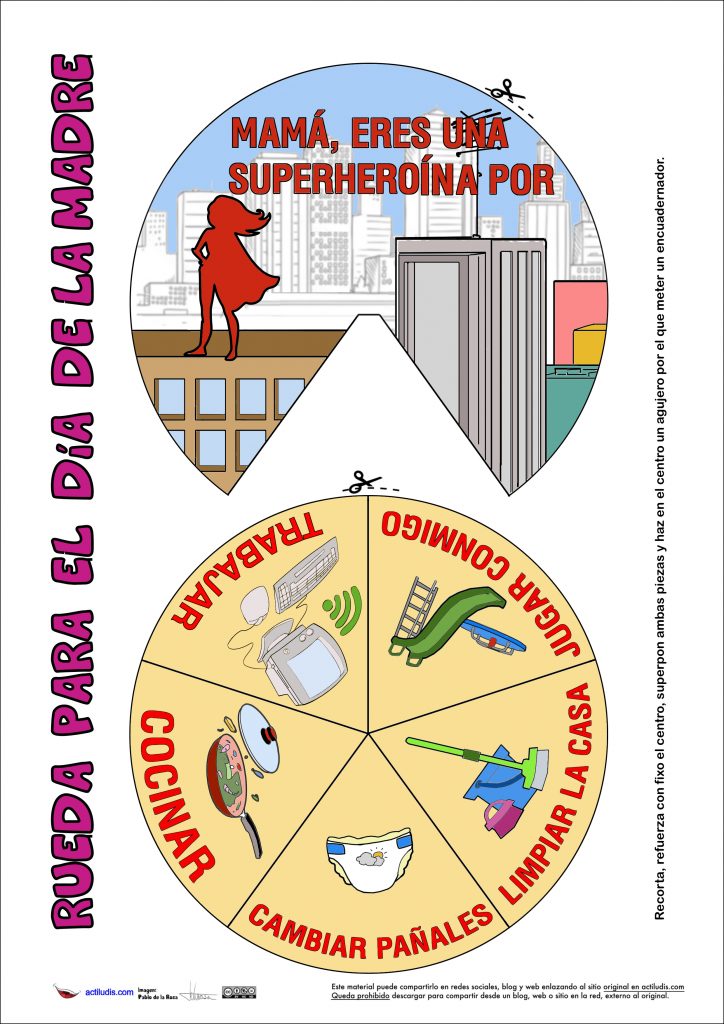 Hemos realizado una rueda para el día de la madre el lema: «Mamá, eres una superheroina por…». Es la misma rueda, pero adaptada, que realizamos en marzo para el día del padre.