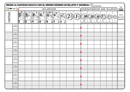 Los billetes y monedas tienen su valor debajo de cada gráfico, además se ha creado una línea con una coma para separar la parte entera de la decimal. Igualmente para cada cantidad que se escriba se ha dividido horizontalmente el espacio para indicar el número de billetes y monedas que se tomen y debajo el valor total (Ejemplo si se cogen 2 monedas de 2 €, arriba ser pone 2 y debajo su valor 4.