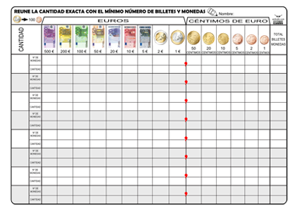 Plantillas en vertical y horizontal para expresar cantidades de euros. Los billetes y monedas están ordenados de izquierda a derecha al objeto de continuar con la notación numérica propuesta del Algoritmo ABN, en la cual los alumnos trabajan con cifras completas y operan de izquierda a derecha. Sin embargo de lo expuesto, estas plantillas pueden usarse igualmente con independencia del algoritmo que se use para el cálculo.