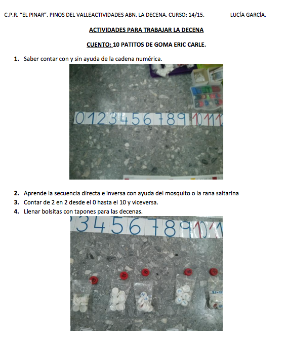 Y para su primera colaboración en el blog nos envía una propuesta de actividades y materiales para trabajar la decena, basadas en el último cuento que ha trabajado este curso con su alumnado de 3, 4 y 5 años. El cuento se titula «10 patitos de goma» de Eric Carle. Lo he usado no sólo para la decena, también hemos trabajado la composición de la centena a partir de decenas completas.