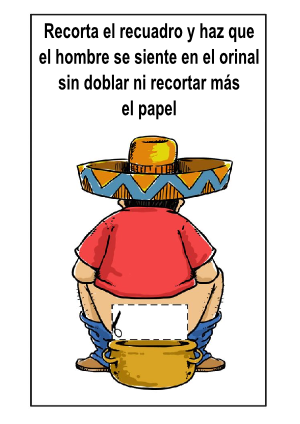 Se trata de que imprimas la siguiente ficha, recortes el recuadro marcado y que sientes al hombre en el orinal, sin recortar nada más que lo ya indicado y sin realizar ningún doblez en el papel.