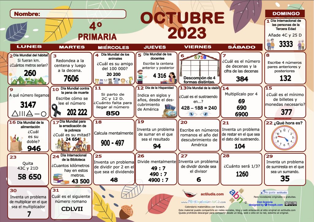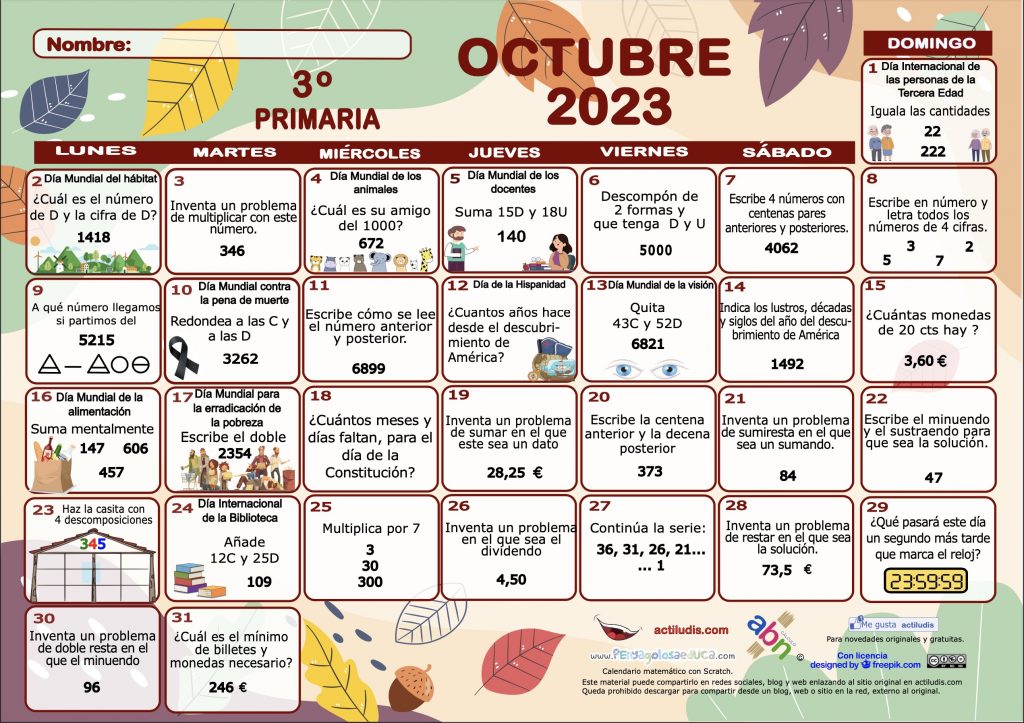 Calendario matemático para el SEGUNDO CICLO de Primaria. OCTUBRE 2023