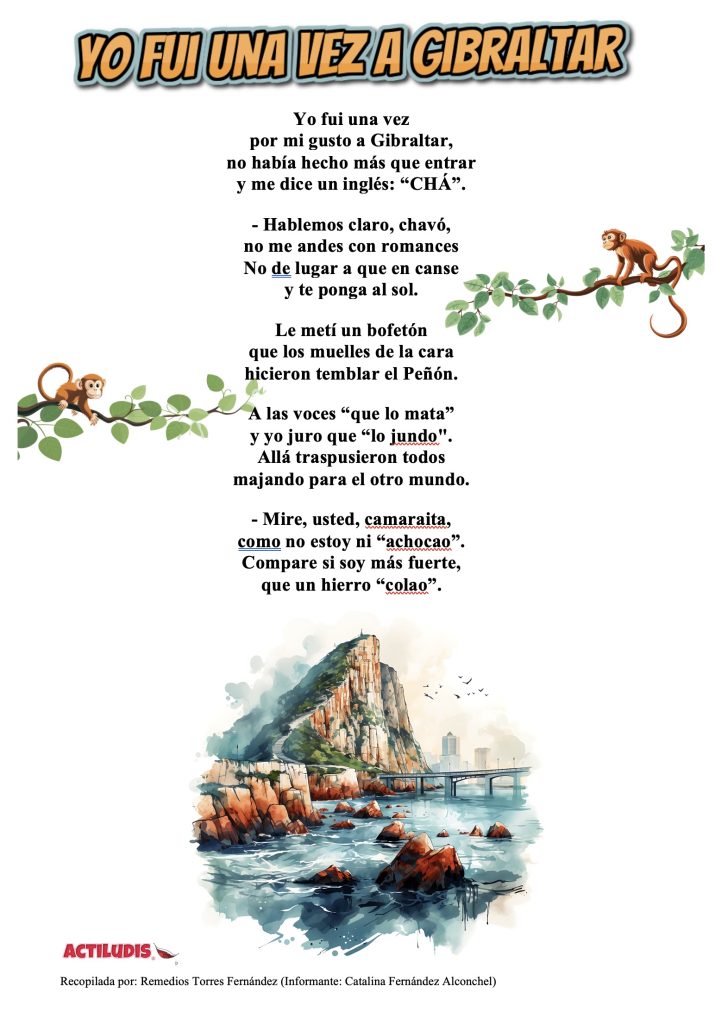Remedios López nos remité este texto que nos indica que es antiquísimo. Si madre, la informante, nació en 1920. Falleció en 2.018. Era muy graciosa y simpática. ¡¡Había que oírla recitando el texto!!. En esta pequeña historia se cuenta el contronazo de un fanfarrón con un inglés en Gibraltar.