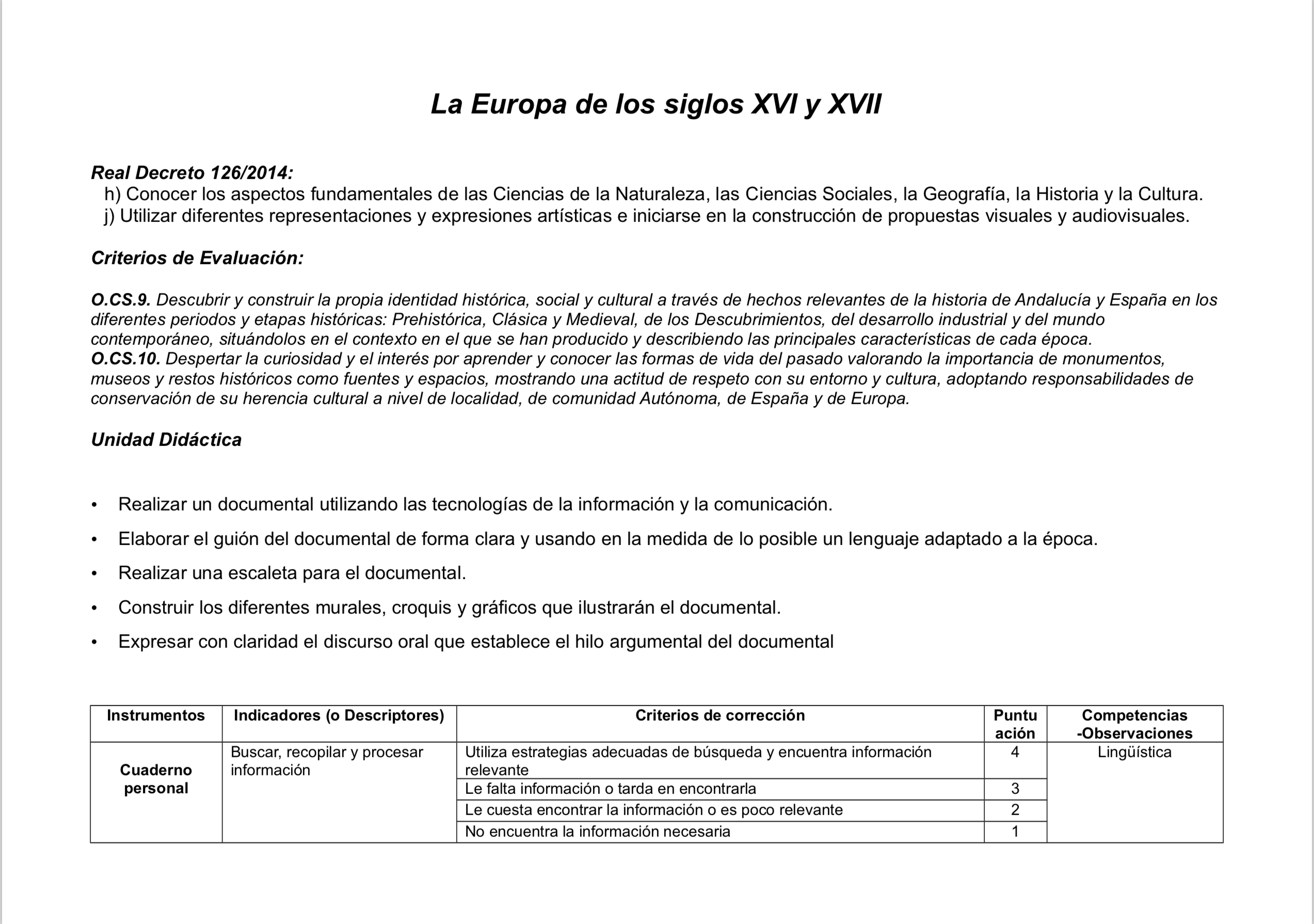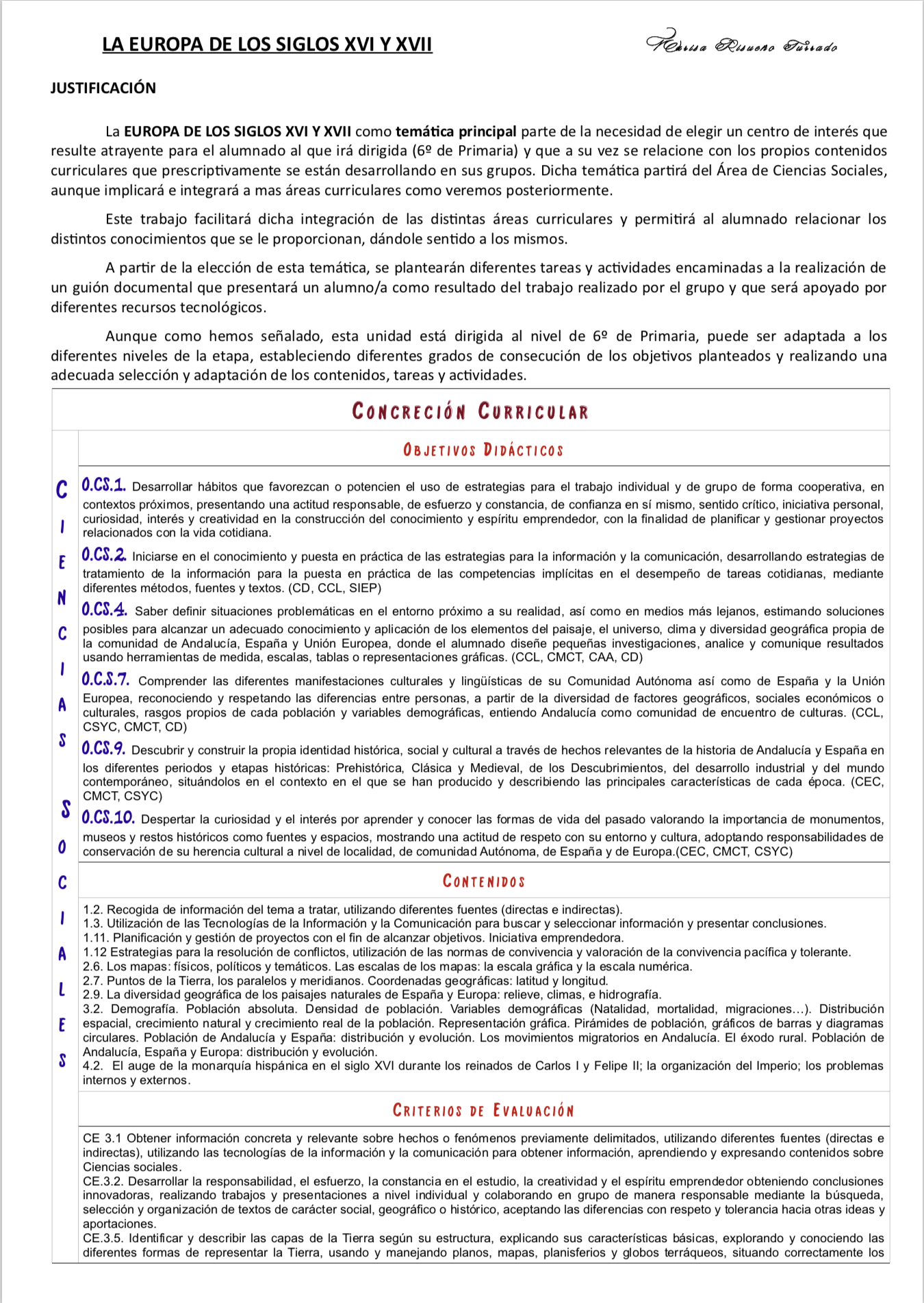 Marisa Risueño Turrado, maestra en el ” CEIP Ntra. Sra. De Los Remedios” de Cártama (Málaga), se ha entretenido, me ha ahorrado trabajo y nos envía para compartir la UDI que ha realizado para trabajar la Europa del Siglo XVI y XVII con su alumnado de sexto de Primaria.