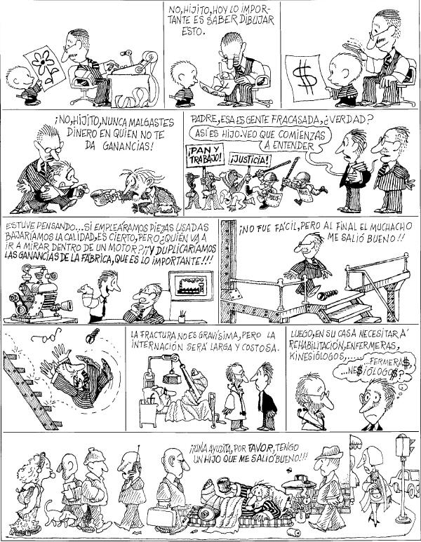 Cómo en todas sus geniales obras, el ilustrador y dibujante argentino Quino, nos sumerge en temas sociales de forma aguda y directa. En esta basta seguir las viñetas para trasmitir valores a nuestros alumnos sin más que ver, leer y reflexionar.