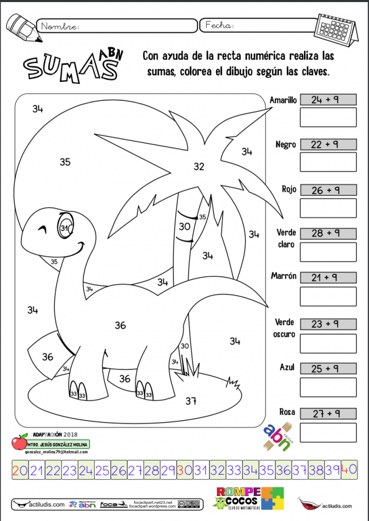 En la presente actividad, se te presentarán diversas operaciones de suma ubicadas a la derecha de la ficha, las cuales deberás resolver utilizando la recta numérica que se despliega en la parte inferior. Tu objetivo será colorear el dibujo conforme a las claves indicadas en cada suma.