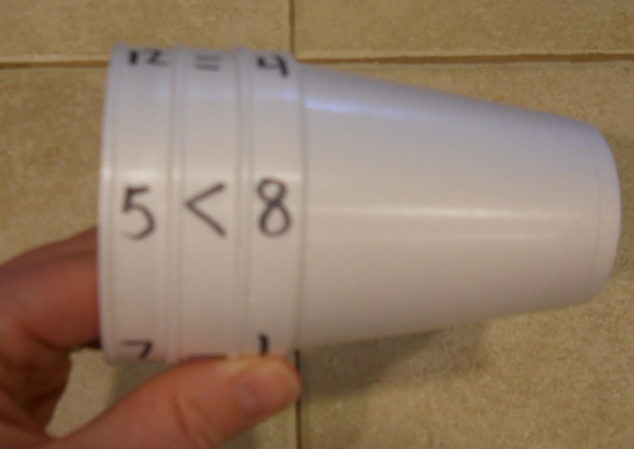 Investigando esta idea también encontré en «Mrs. T’s First Grade Class» la posibilidad de trabajar, con sólo tres vasos, los conceptos de mayor que…, menor que…, e igual que… tal y como puedes ver en la siguientes imagen.