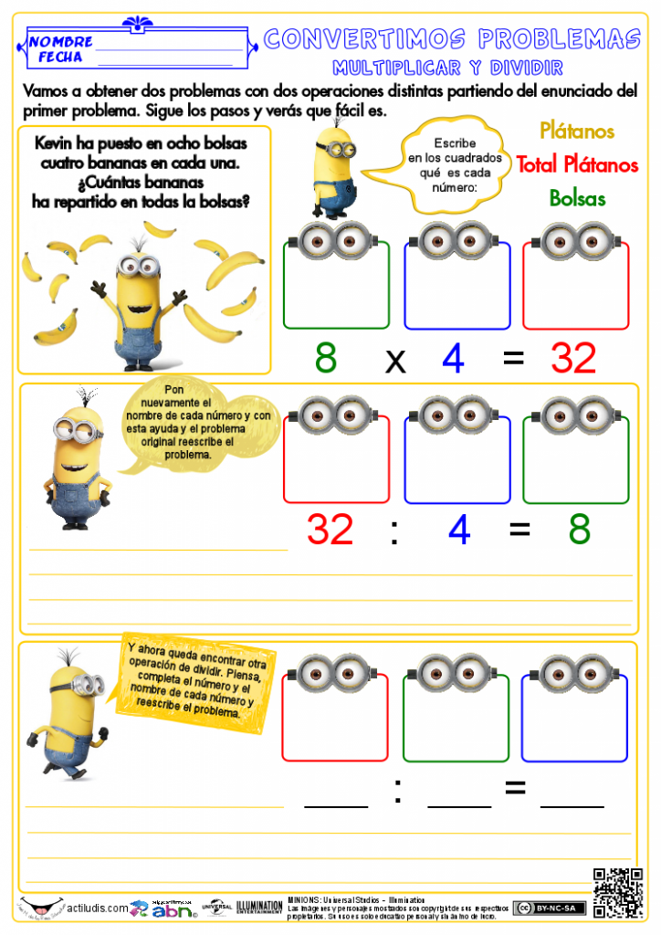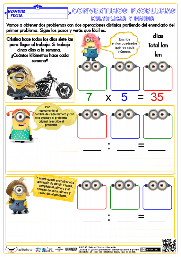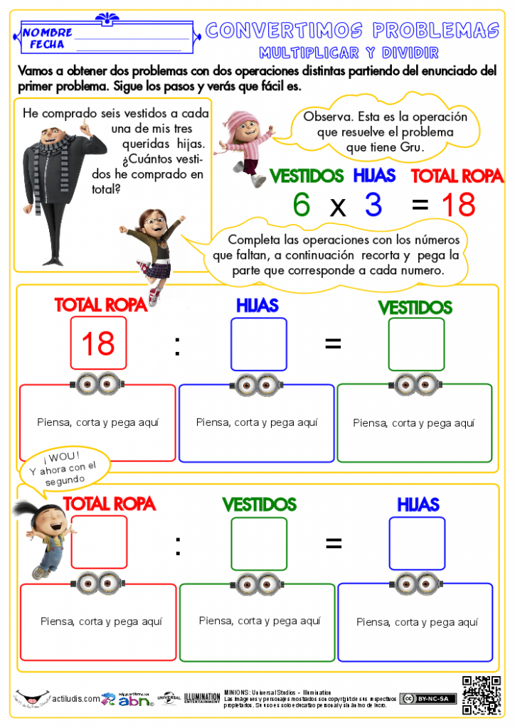 Con esta ficha trabajamos la creación de problemas a partir la conversión de problemas de multiplicar en problemas de dividir al estilo que podemos encontrar el los libros del método ABN de 4º de Primaria. En concreto en esta ficha la dificultad es mínima ya que se guía mediante un código de colores, la cualidad asignada a cada número en función del enunciado del problema y unos recortables con parte del problema de forma que tras el proceso tan sólo quede leer y si se desea copiar los nuevos problemas con sus operaciones en el cuaderno.